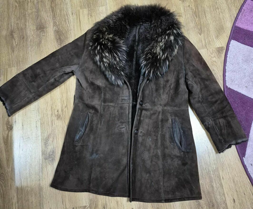 Sprzedam futerko ze skóry naturalnej, owczej ,ciemny brąz z ozdobnym kolnierzem, bardzo ciepłe.Rozmiar 44,długość całkowita 80,długość rękawa 57,pod pachami 60 cm.tel 799 - pokaż numer telefonu -