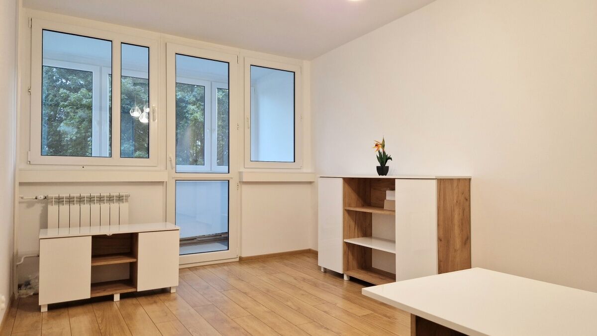 W salonie może stanąć rozkładany narożnik, są już nowoczesne meble: komoda, stolik RTV i ława. Meble zostaną uzupełnione w zależności od potrzeb najemcy.