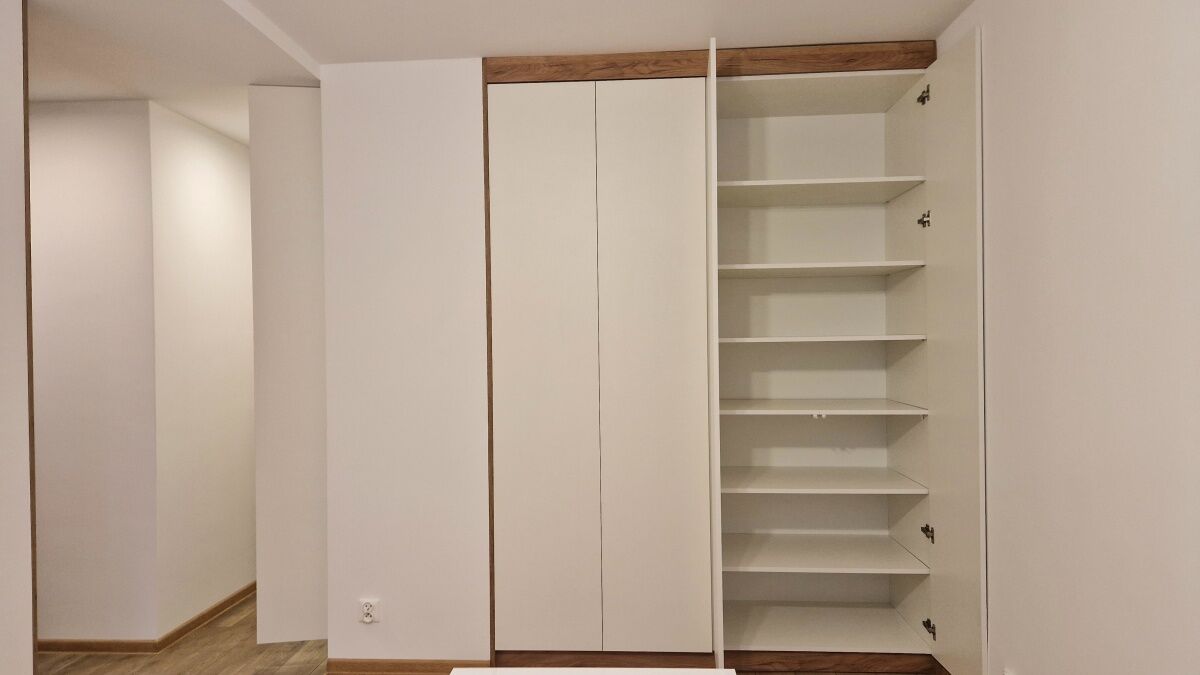 Obszerna szafa garderobiana i kilka szafek w zabudowie przedpokoju z dużą ilością miejsca na garderobę i buty.
