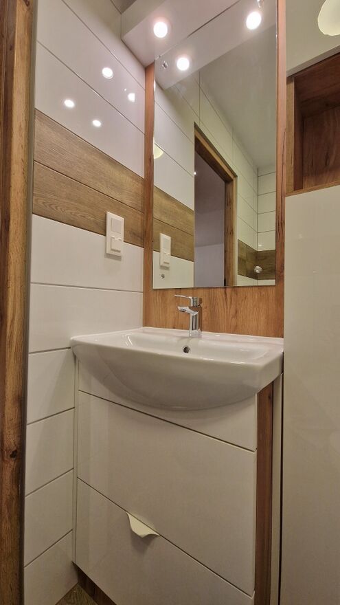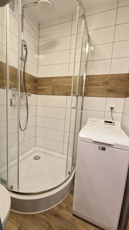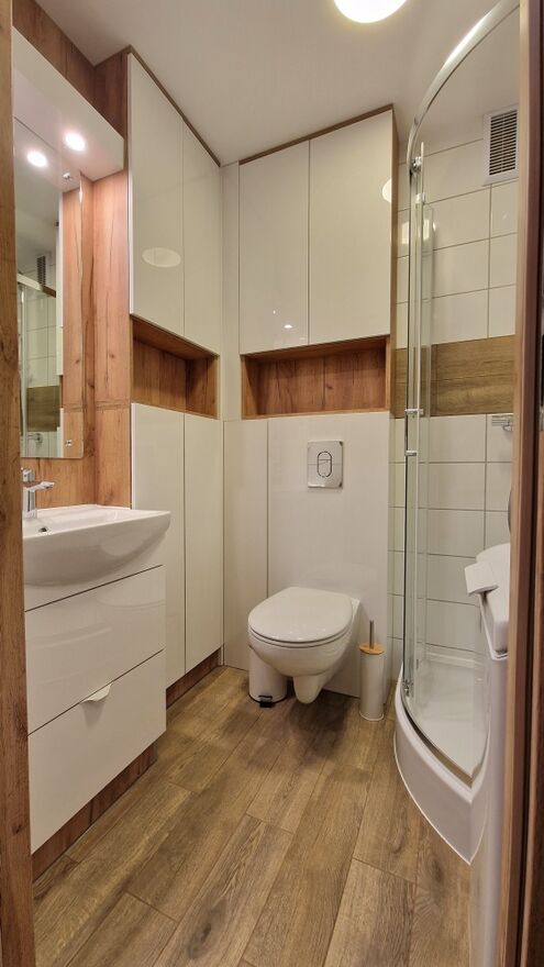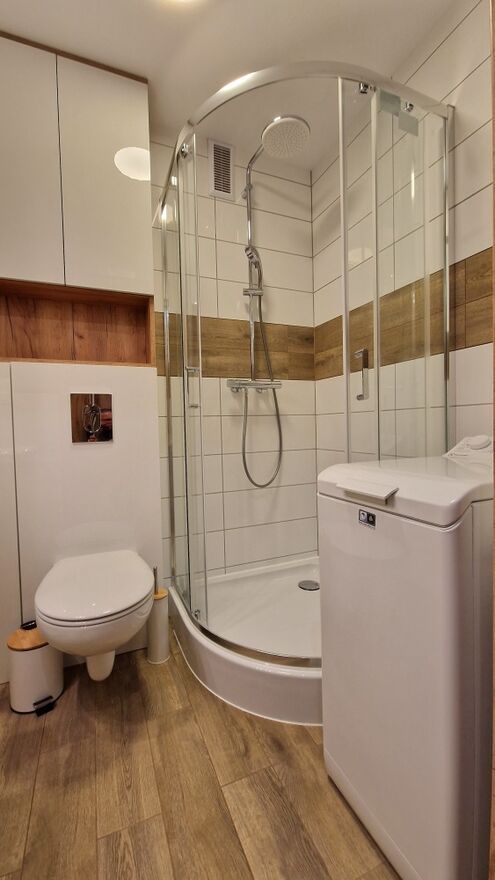 W łazience wygodna kabina natryskowa z bezpiecznego szkła, umywalka z szafką z szufladą i z lustrem, pojemne szafka na kosmetyki, ręczniki i inne przybory toaletowe, zmieszczą się kosmetyki Jej i Jego, toaleta rimfree, wolno opadająca deska, energooszczędna pralka, wsad do 6kg.