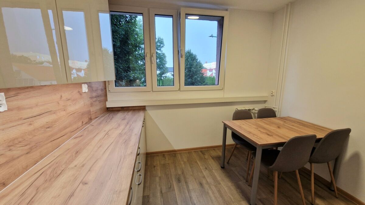 Kuchnia ze stołem dla 4 osób i wygodnymi krzesłami w stylu skandynawskim, w pełni wyposażona w czajnik elektryczny, kubki, szklanki, kieliszki, komplet talerzy, sztućce, garnki do płyty indukcyjnej i itd.