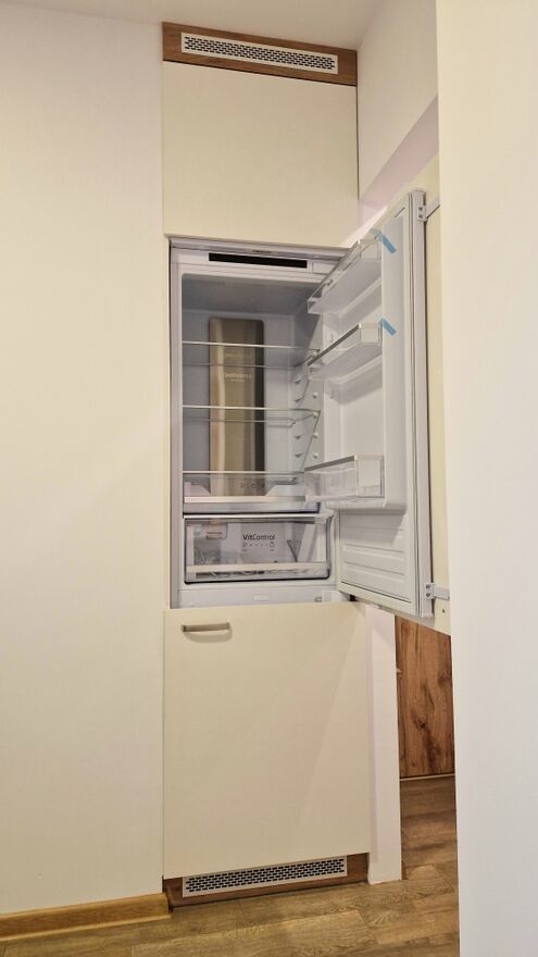 W kuchni drzwiczki szafek z cichym domykiem, duża zabudowana lodówka i zamrażarka no frost, oszczędna zmywarka, piekarnik z funkcją mikrofalówki, płyta indukcyjna, okap zabudowany, niewidoczny, oświetlanie led, oszczędne i zapewniające wystarczającą ilość światła.